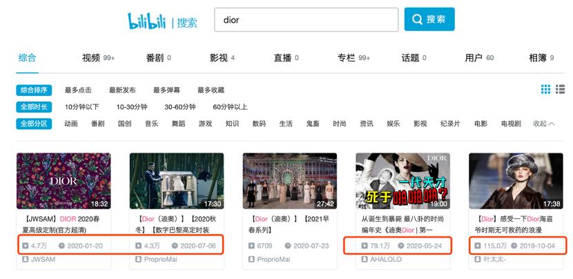 如果我们在B站中搜索“Dior”,其实不难发现有许多相关的主题视频播放量能够达到几十万、几百万的量级,这其实意味着B站用户对相关内容是有需求的,但这也与Dior自身的播放量形成了较大对比,原因其实在于,品牌方可能单纯把B站当做成另一个信息分发平台了,而非内容创作平台,这跟品牌进入B站的姿势有关。