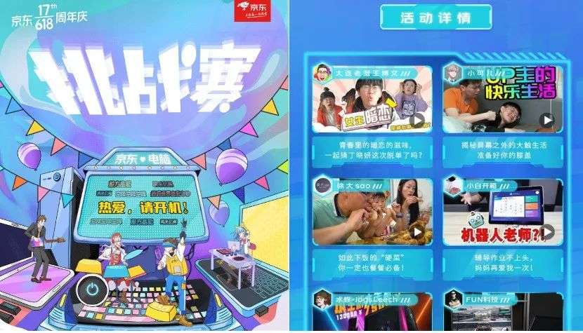 用对UP主可以让品牌事半功倍。今年618,京东电脑通过B站内容来引爆传播。针对京东电脑的目标人群,品牌选择了6大科技类UP主进行话题合作,将他们分为戏精类UP主和种草类UP主,组成“创造力天团”,为热爱开机。通过KOL的组合化内容合作,让整个事件站内曝光超过1600万,也获得了目标圈层的认同。