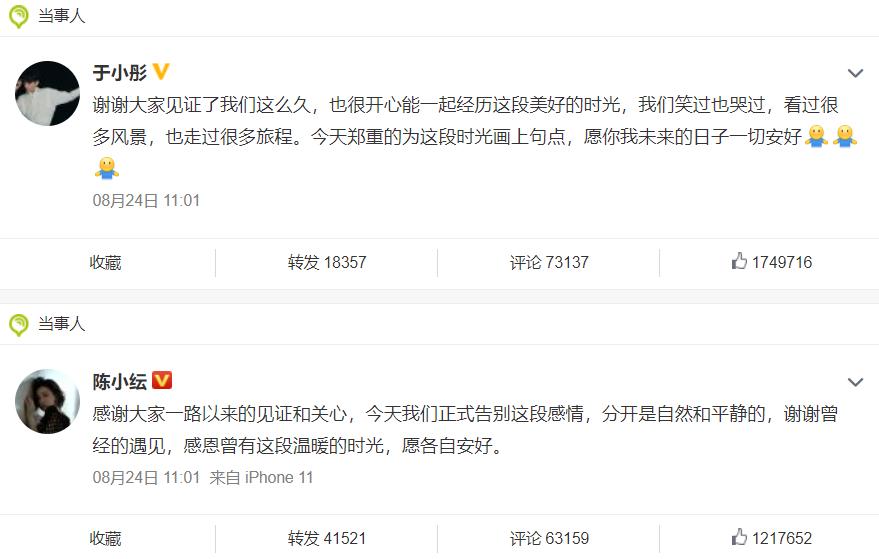 周一下午,恋爱一年多时间的于小彤和陈小纭在微博官宣了分手的消息。