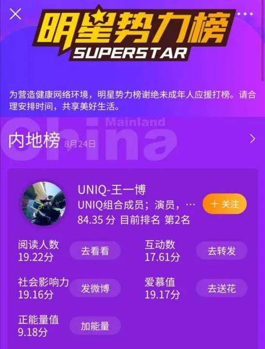 相比较其他粉丝平台,微博超话中的粉丝价值更高,能够直接对明星产生影响。从商业角度来考量,超话排名以及活跃度就相当于明星的影响力,粉丝不断提升超话排名的过程,就是为明星本人的商业价值增值。