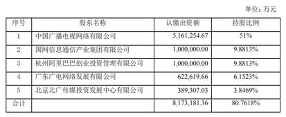 持股比例前五名的发起人分别为:中国广播电视网络有限公司、国家电网旗下的国网信息通信产业集团有限公司、阿里巴巴旗下的杭州阿里巴巴创业投资管理有限公司、广东广电网络发展有限公司、北京北广传媒投资发展中心有限公司。上述五家企业合计持股比例超过80%,将在新公司中起到主导作用。