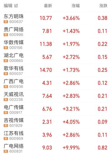 8月27日开盘,A股上市公司广电网络 “一字涨停”。截至下午收盘,11家广电系上市公司均收涨,除了广电网络外,吉视传媒上涨4.05%,东方明珠上涨3.66%,电广传媒上涨3.21%,湖北广电、广西广电、天威视讯、江苏有线涨幅也在2%以上。