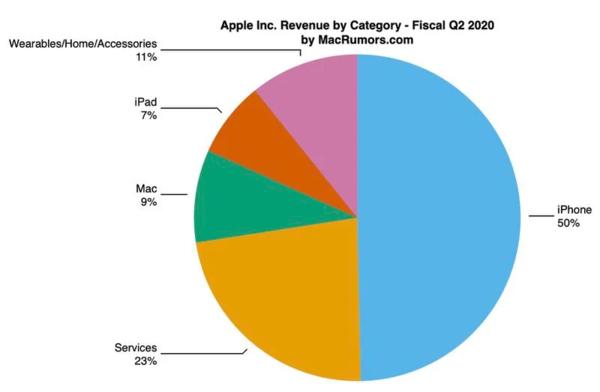 我们来看数据,一个直观的数据就是iPhone在苹果收入中的占比,下面是苹果的2020年Q2收入组成图,苹果的收入由五部分组成,分别是iPhone、iPad、Mac、服务收入和其他收入(AirPods、Apple Watch属于此类),iPhone正好占比为50%。