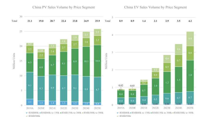 其中,小鹏汽车所切入的中高端市场是中国电动汽车市场的最大市场。占2019年销量的47.2%。预计这一细分市场仍将是最大的,到2025年将达到180万台。
