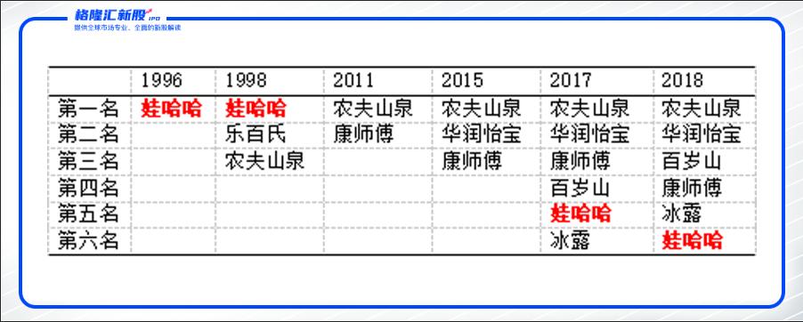 据格隆汇新股不完全统计,1996年,娃哈哈就已成为国内瓶装水一哥,并连续几年稳坐老大宝座。