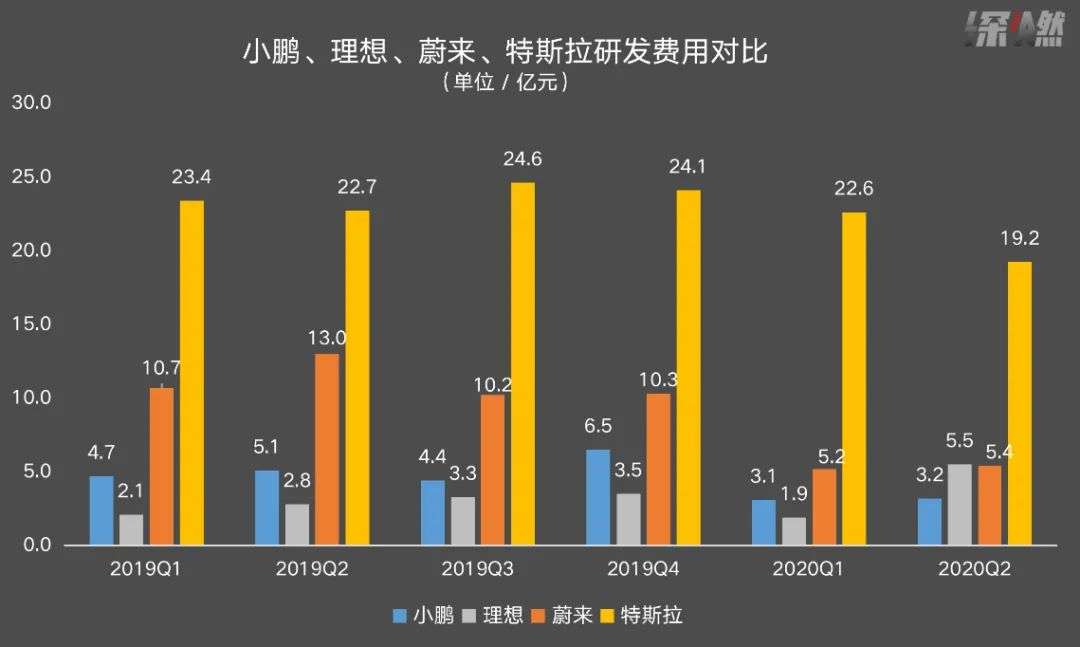 但只看研发费用这一项,小鹏的优势就不明显了。2018年至2020年3月底,蔚来的研发费用将近90亿元,同一时间段内,理想的研发投入为21.53亿元。如果再把特斯拉加上,国内三个新造车加在一起,也比不了人家一个。