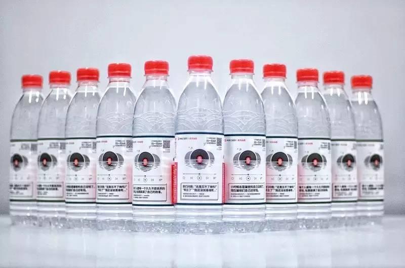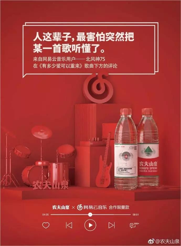 2017年,农夫山泉跨界合作网易云音乐,将精选的30条网易云音乐的评论,印在农夫山泉饮用水的瓶身,再以网易云音乐的黑胶唱片为造型,拼成农夫山泉的Logo。