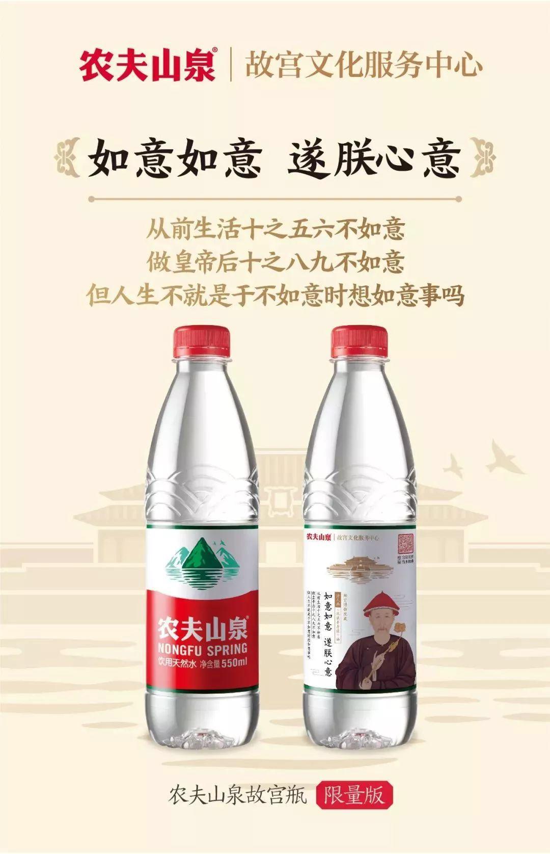 2018年,农夫山泉与故宫合作,将故宫元素融入瓶身,联合推出9款限量版“故宫瓶”,再一次读懂了年轻人的喜好。