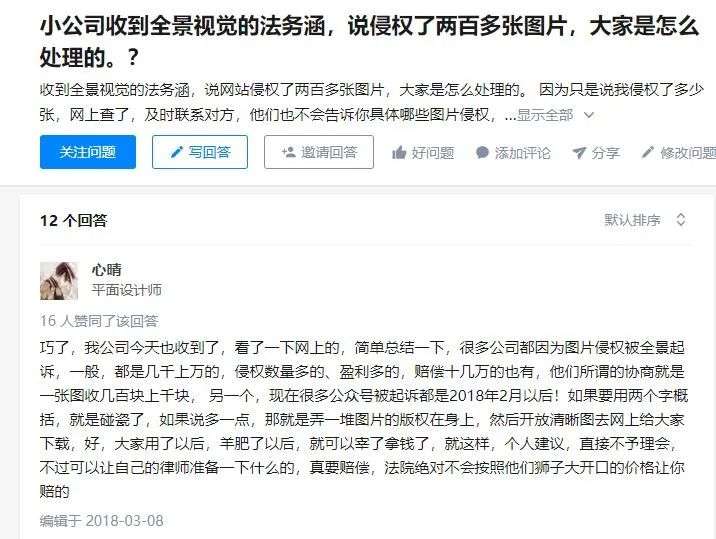 网络上可以看到很多类似的公号运营人员发帖求助,情节大同小异,都是自己收到律师函,声称图片侵权,索要高额赔偿。