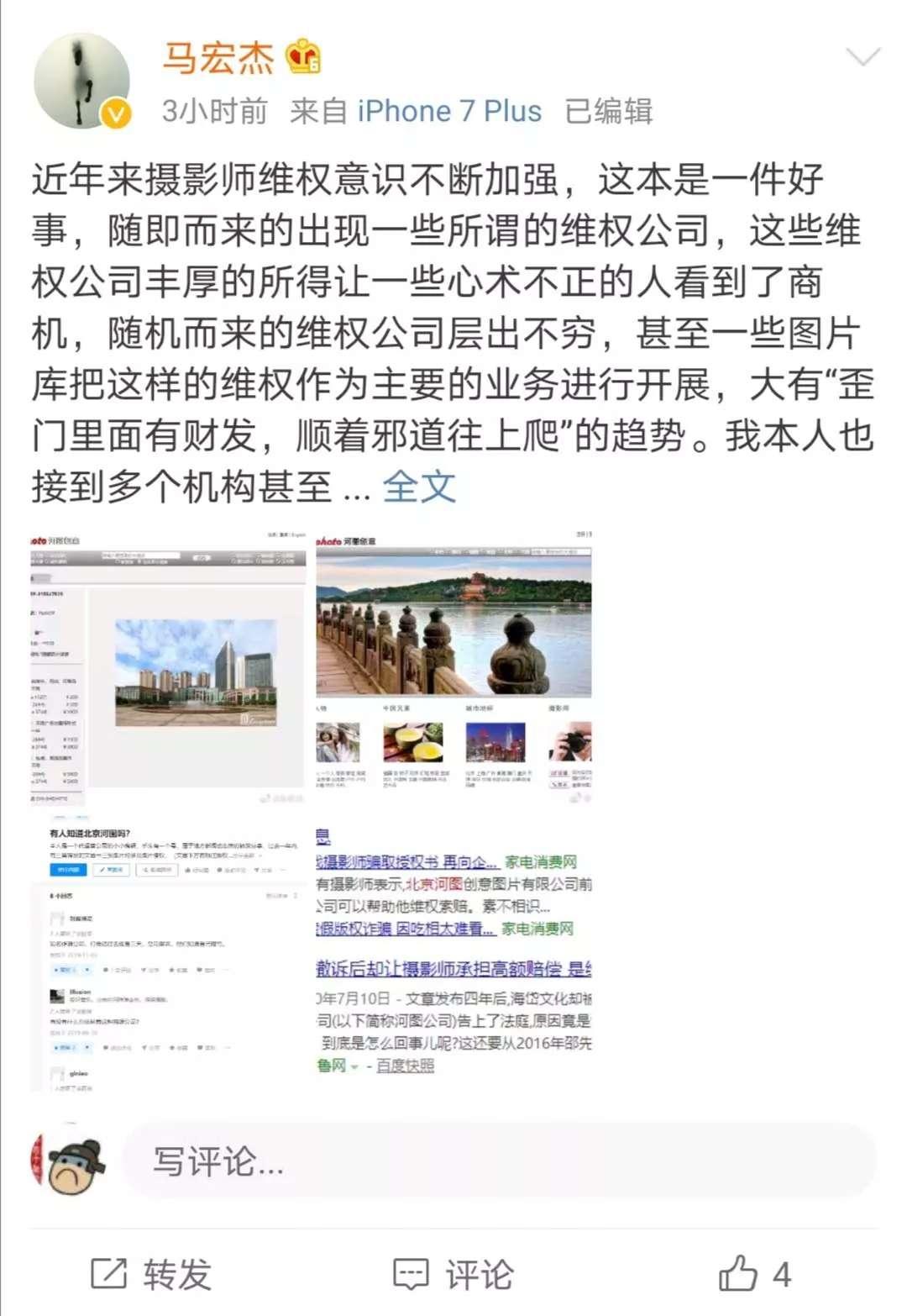 今年8月6日,微博昵称@马宏杰 发文,提醒摄影师朋友警惕北京河图创意图片有限公司,称这类公司声称的替摄影师维权,属于诈骗行为。
