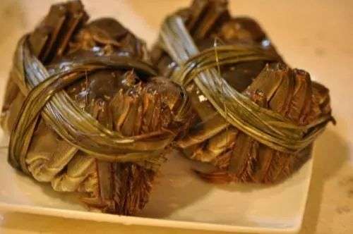 猪肉丝、鱿鱼丝、香菇丝、炸红葱头爆炒,炒熟后与蒸熟的糯米均匀搅拌,再在拌好的糯米饭上铺上大红鲟,包裹上荷叶大火蒸熟即可。