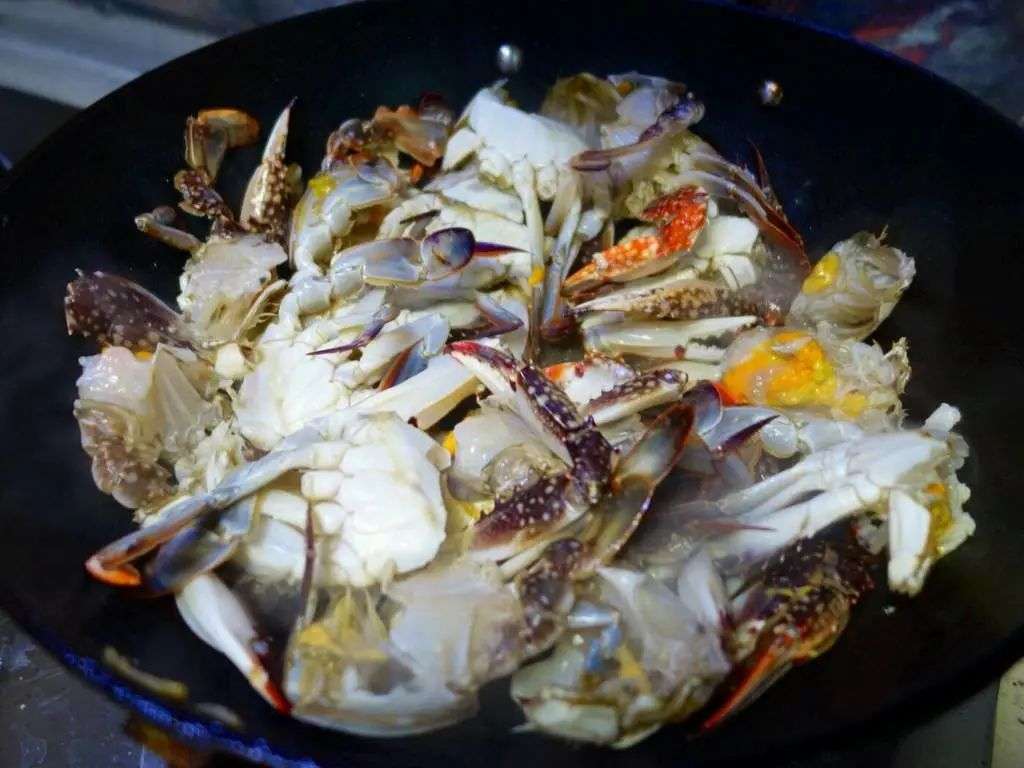 梭子蟹除去蟹腮、蟹肠、蟹胃、蟹心,切块。