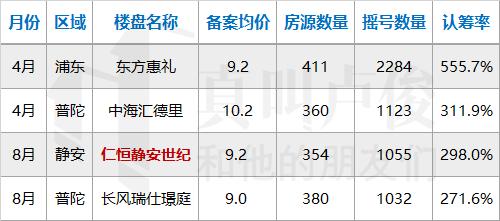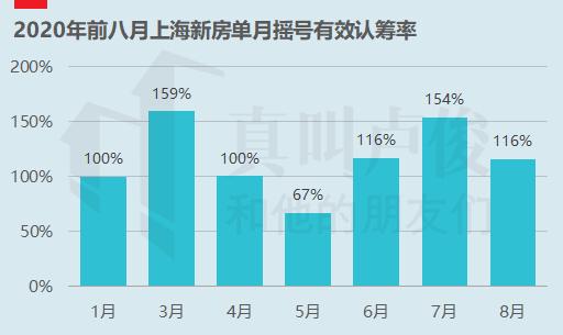 截止至8月26日仁恒静安世纪开盘之后,前八月的上海新房单月摇号有效认筹率统计之后,2月由于疫情关系,无新盘供应,五月在4月井喷供应后,认筹有所回落。