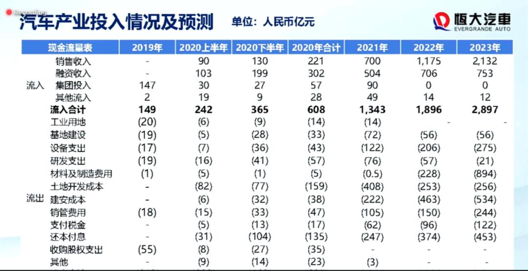 潘大荣在此次发布会上透露,恒大集团预计将为汽车业务共计投入294亿元。2019年投入147亿元,2020年上半年,共计投入30亿元,资金主要投往股权收购、基地建设、研发、设备等。预计今年下半年继续投入27亿元,2021年投入90亿元,共计再投117亿元。此后恒大汽车量产并实现销售后,集团将不再有投入。
