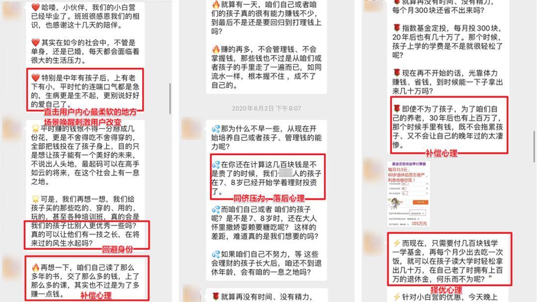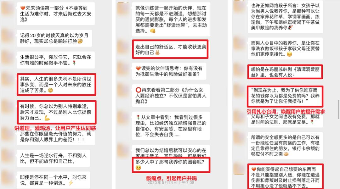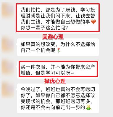在理财训练营课程中,班班每天早上做的晨读分享,可以说是通过讲故事占领用户心智、试图影响用户价值观的典范。这些分享总会给人一种“对对对,你说的都对”的感觉。