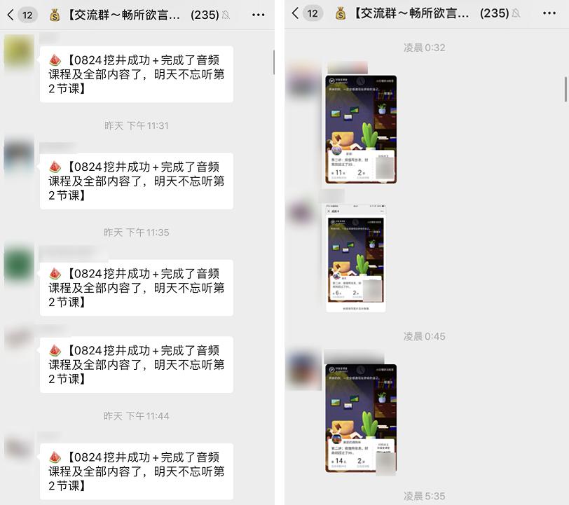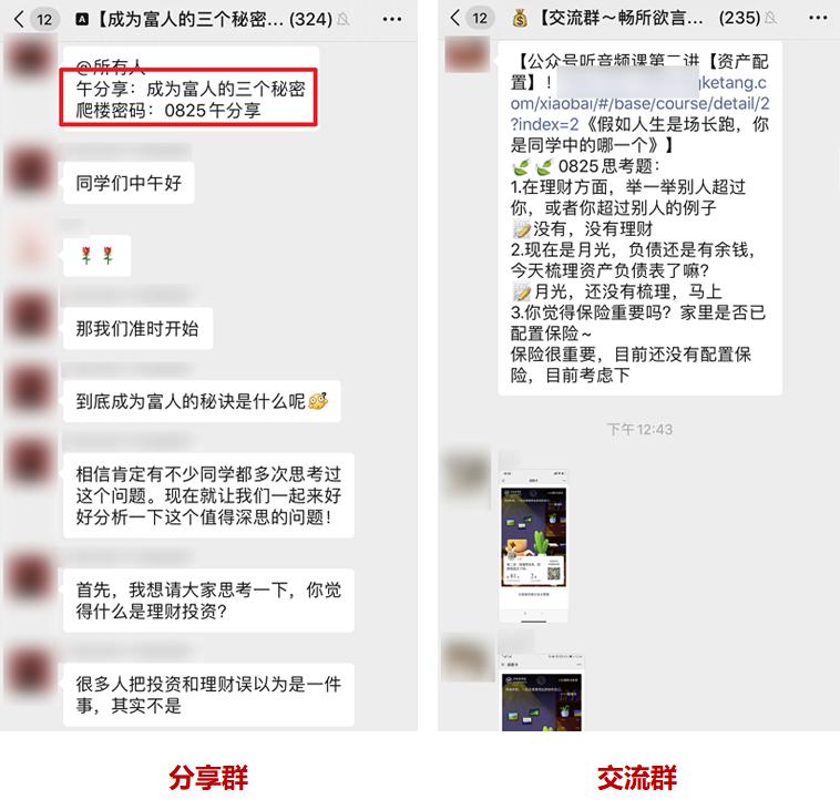 理财课程的训练营一般会建立 2 个社群,一个班级群,一个交流群。班级群是班主任做分享、解答用户疑问的地方;而交流群是引导用户打卡交作业的地方。