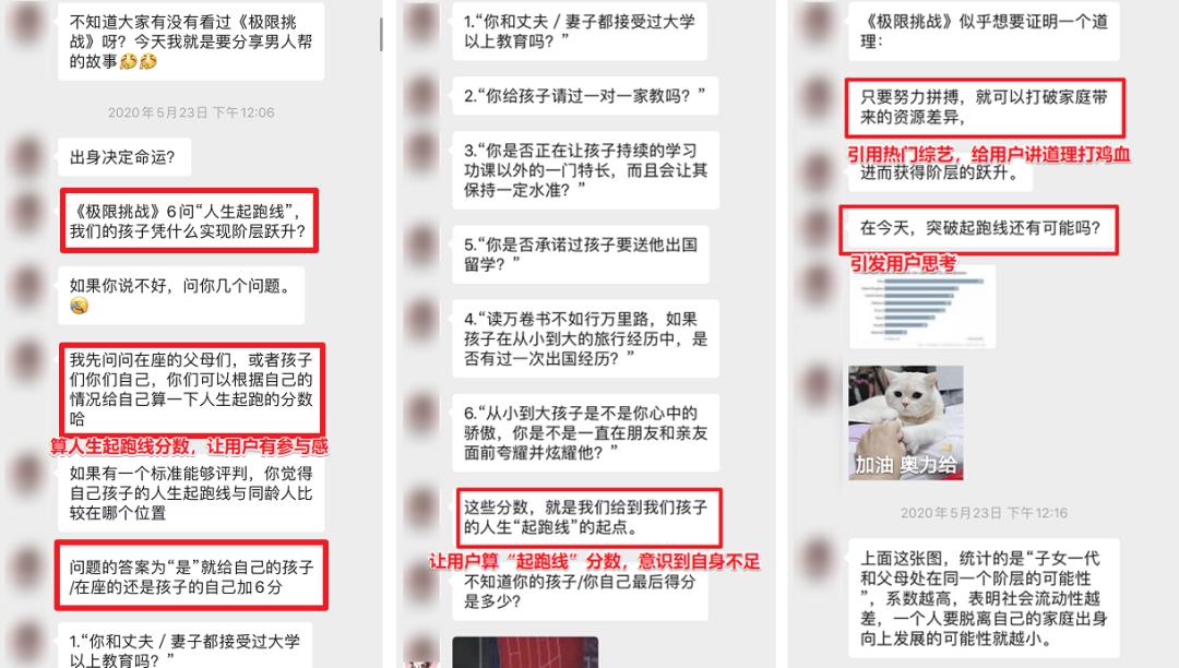 比如班班在分享的时候,用热门综艺《极限挑战》做引子,用人生起跑线 6 问引发用户思考,加强用户的参与感。