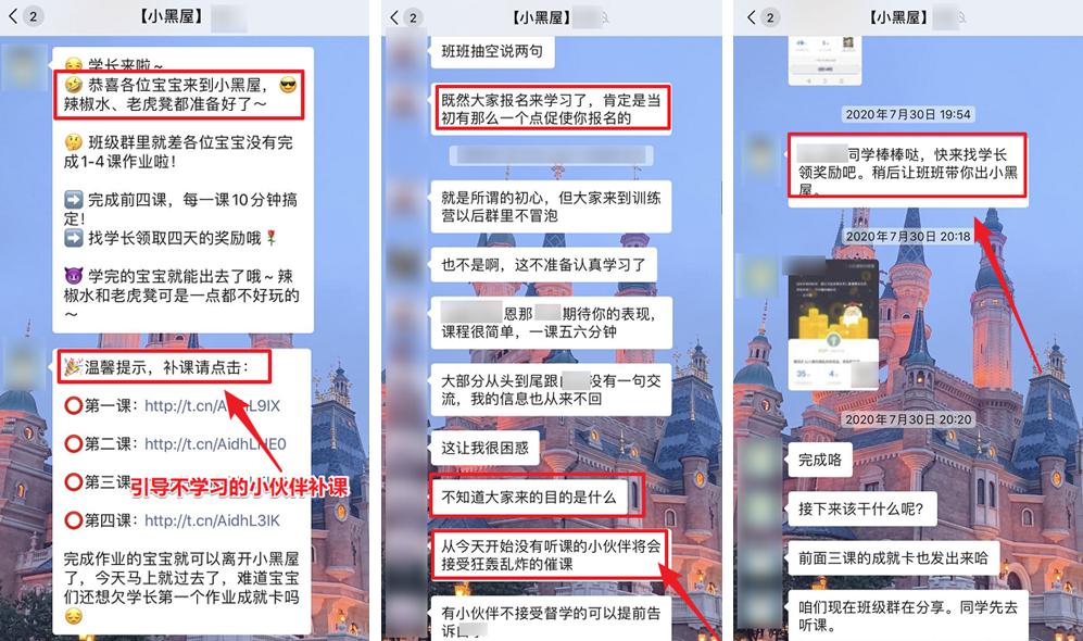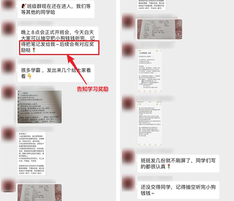 紧接着重点来了,班主任在拉用户进群期间,还会晒一些学霸笔记并告知大家学完会有奖励,奠定了社群氛围基调——学习型社群,同时激发用户学习的欲望。