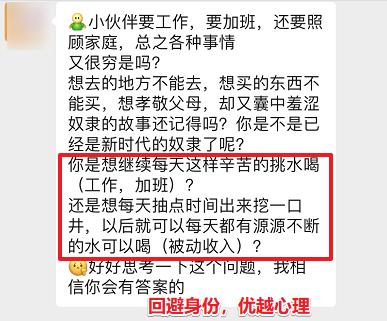 ② 回避身份,是不想让自己因为没有学习而成为一个自己不想成为的人。比如班班会说,你是想继续每天加班辛苦挑水喝嘛?(类比手法,把工作、加班比作辛苦挑水喝)