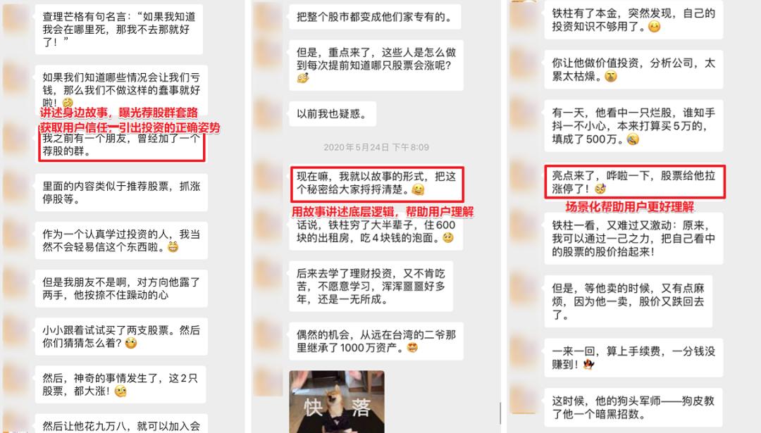 比如班班在给大家揭秘荐股群套路的时候,就用讲故事的方式,吸引用户的注意力让大家持续听下去。