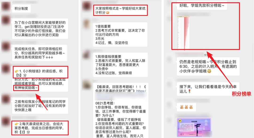 为了提升用户参与感,加强用户的学习动力,理财训练营的助教团队(学长、学姐),会利用积分的形式鼓励用户参与社群内容的输出。