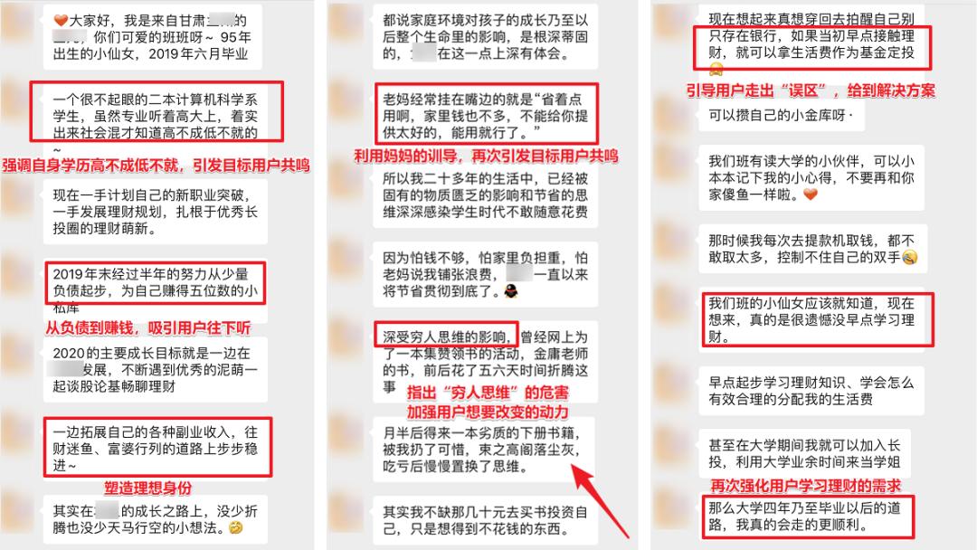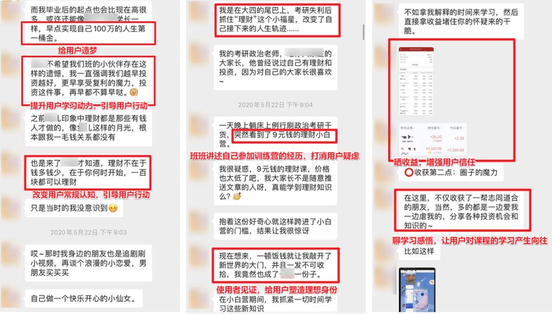 另外,班班还会讲述自己在以前作为学员和理财训练营结缘的故事,分享自己的学习收获和感悟,分享学完理财课程的收益,一步步刺激其他用户加入到课程的学习中来。