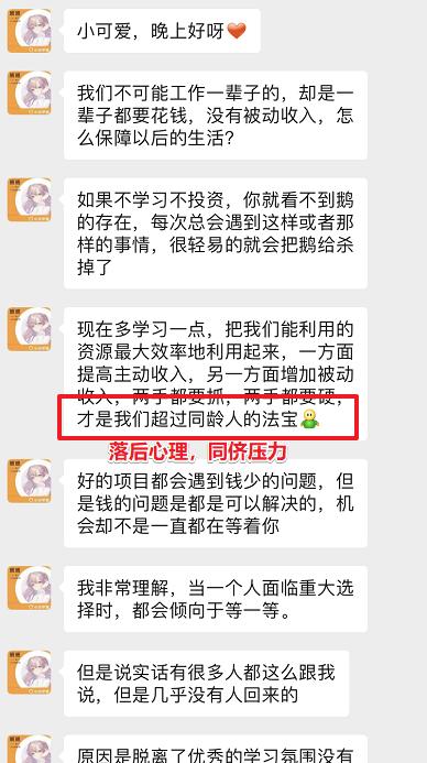 举个例,比如班班会说如果你不学习不投资,没有被动收入保障不了以后的生活;如果学习就可以增加被动收入,超过同龄人。