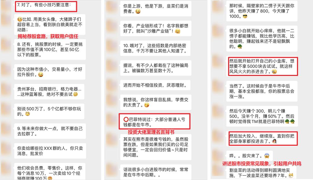 比如训练营的班班就是通过深扒荐股群的套路,引用股神巴菲特的至理名言,和用户建立信任的。