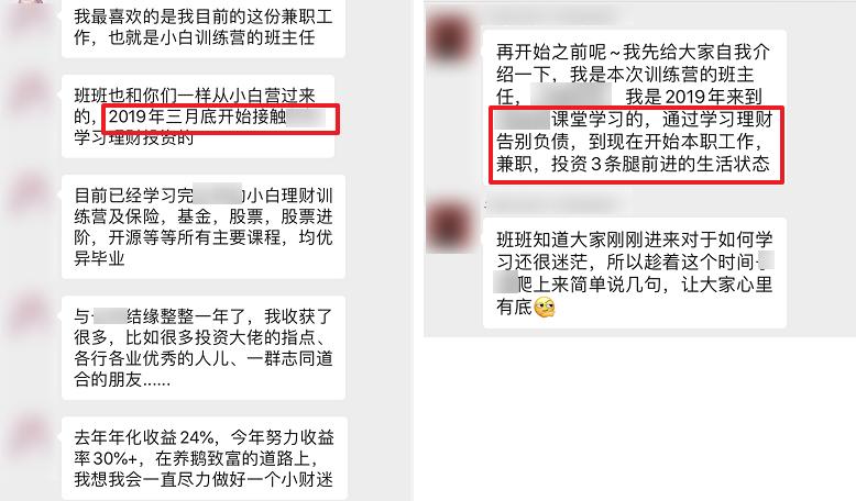我是 2019 年在 XX 课程学习的,通过学习告别负债(以往是比较悲催的状态),到现在开始本职工作,兼职,投资 3 条腿前进的生活状态(理想状态)……