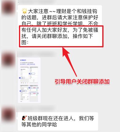 比如某理财训练营的班班会在用户刚进群时,会贴心地教大家如何关闭群聊添加。一方面可以让用户觉得“班主任”在为他们着想;另一方面,可以防止竞品或“流量党”私加好友。