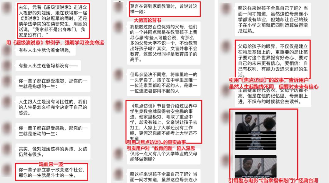 班班会从自身经历出发,用自己的故事感染用户增强信任;每天的晨读分享,会帮助用户塑造价值观,让他们心中燃烧起学习的热情;引用热门综艺引发用户共鸣,引用经典的电影、电视剧情节台词,给用户灌鸡汤、打鸡血;