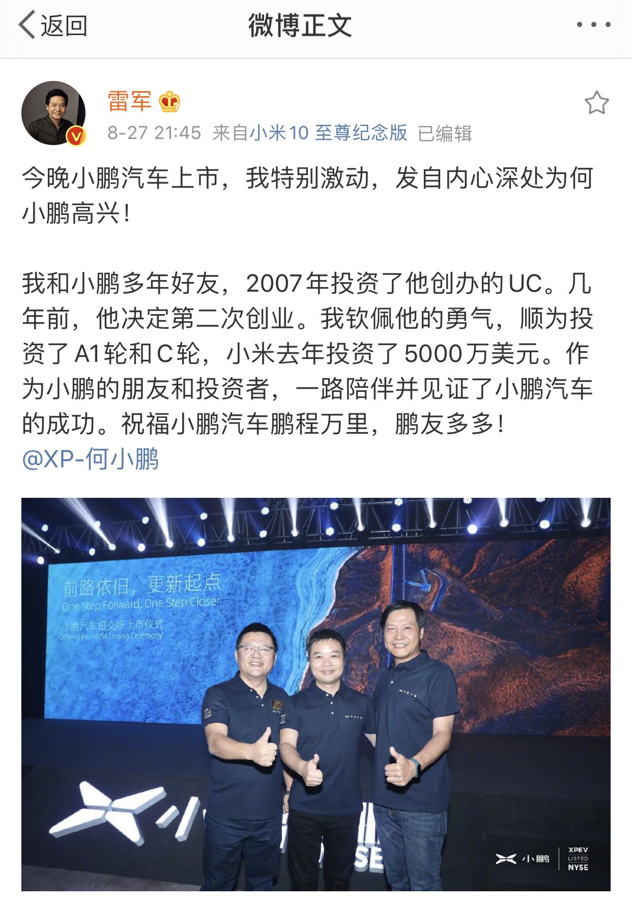 当日晚间,雷军通过其个人微信公众号、微博发布多条消息庆祝小鹏汽车上市,并表示,2007年他就曾投资了何小鹏创办的UC,对其二次创业的勇气表示钦佩。之所以参与小鹏汽车的投资,不仅是出于良好的朋友关系,也是基于对智能电动汽车这条赛道的持续看好。