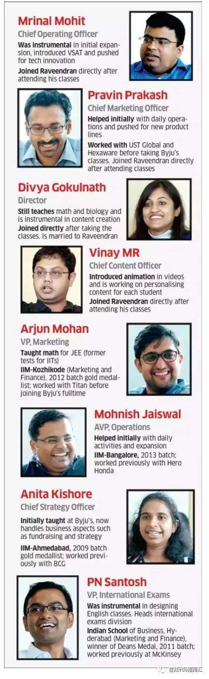在创立公司更早之前,Byju这些学生更多的角色是教师,和Byju一样辅导学生考试。Byju Raveendran负责公司的所有管理和执行工作,到下一阶段,他的学生几乎完全接管了细分管理职位。