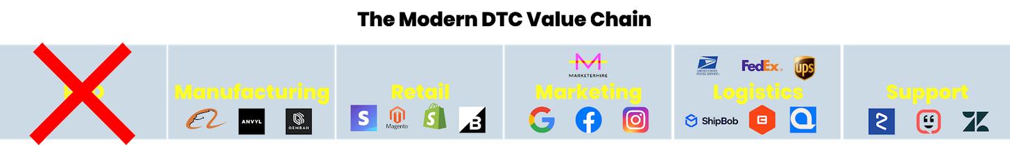 首先,我们先来看一下DTC的价值链,这是公司为了将产品直接交付给消费者而进行的一系列离散而又相关的活动。