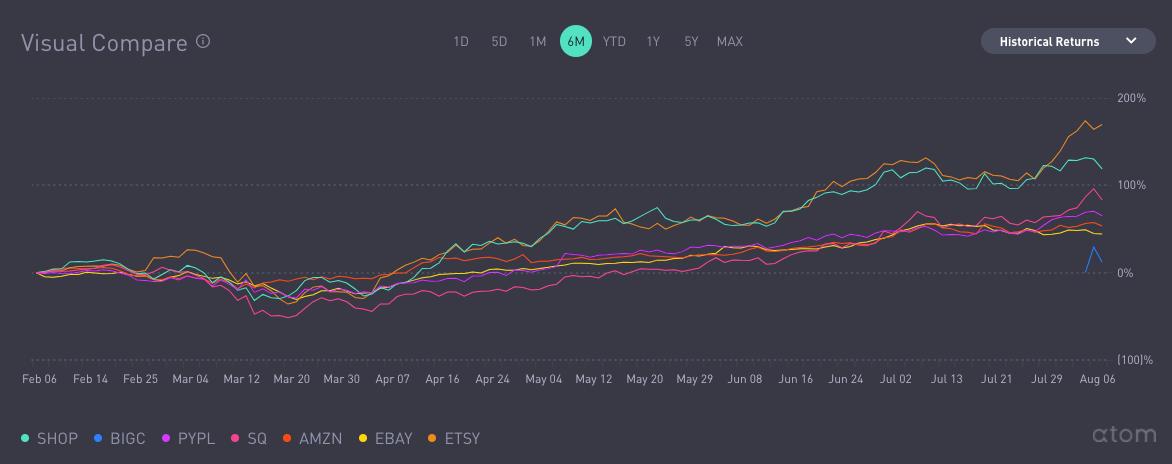 新冠病毒大流行开始时,网上购物的占比是16%。现在,这个数字已经提高到将近34%。投资者最喜欢看到这种曲棍球棒式(J形曲线)的增长,而电子商务基础设施公司的估值也因此一路飙升。在过去两个星期的时间里: