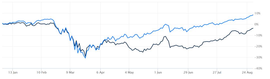 今年以来伯克希尔A类股(黑色线)与标普500指数(蓝色线)走势对比图(截至8月28日)