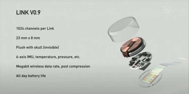 另外一个重要进展是,植入器件的微型化和无线传输设计。按照马斯克的说法,这是一个 23 毫米直径硬币大小的圆片,可以采集传输上千(1024 个)通道的神经放电信号。
