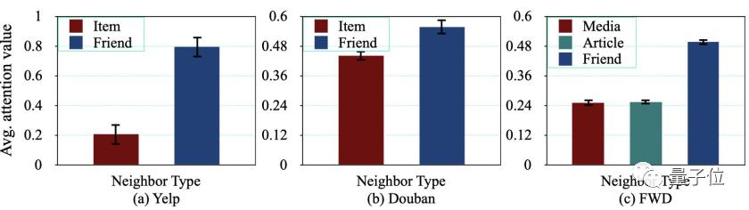 SIAN模型学习得到的好友类型的平均注意力权重值,显著大于物品类型的平均注意力权重。