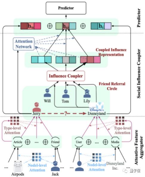 另外,团队设计了一个社交影响力耦合器,其用来捕获一个有影响力好友(例如 Tom)和一个物品(例如和airpod相关的文章)的联系, 从而量化这个“组合”的综合影响力程度。
