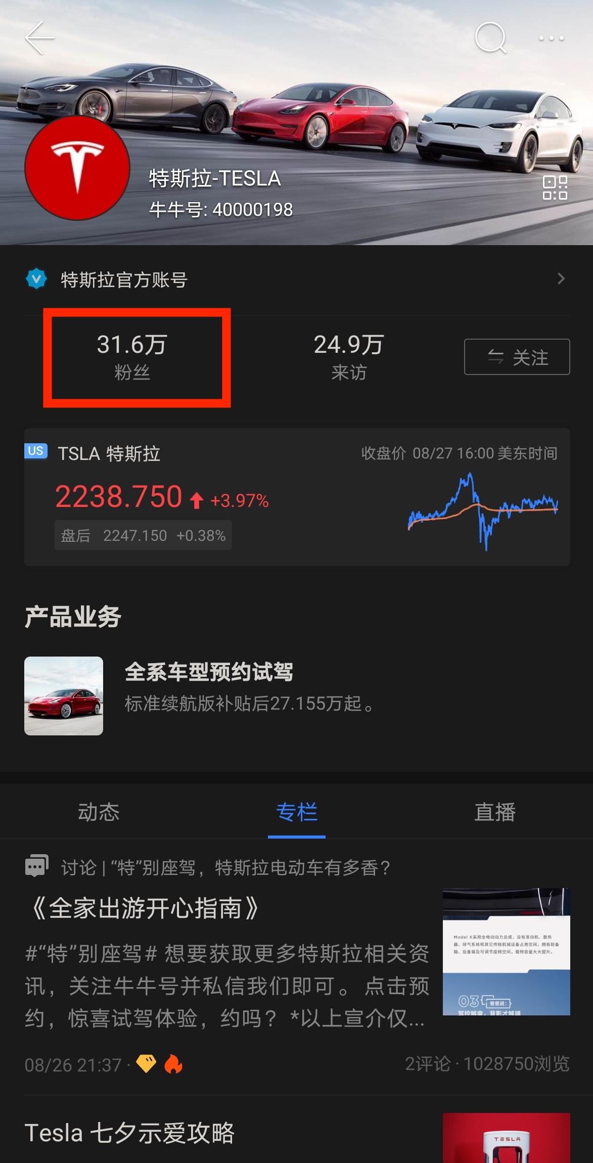目前,富途牛牛的企业号已经吸引了包括腾讯、拼多多、小米和同程艺龙等200多家企业入驻,有200多家企业在富途通过直播向个人投资者同步上市仪式、业绩发布、产品发布和高管访谈等动态。Q2 期间内,特斯拉开设了富途牛牛企业号,这是特斯拉官方首次且唯一入驻的投资社区,入驻仅半月就拥有了10余万粉丝和近700万文章浏览量,截止发稿,特斯拉企业号的粉丝量已经超过了30万。