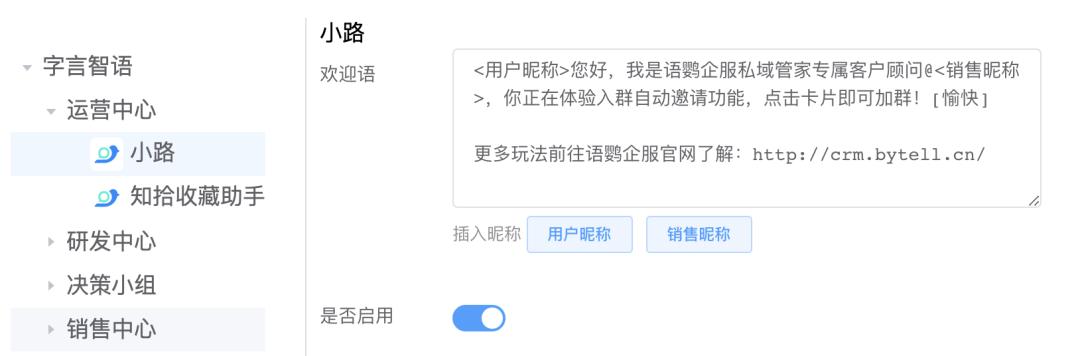 语鹦企服欢迎语可根据不同部门/不同员工差异化配置。比如新好友添加的是员工小路,则选中小路,按照提示配置欢迎语信息。欢迎语可插入用户昵称/销售昵称,显得更加专业贴心。