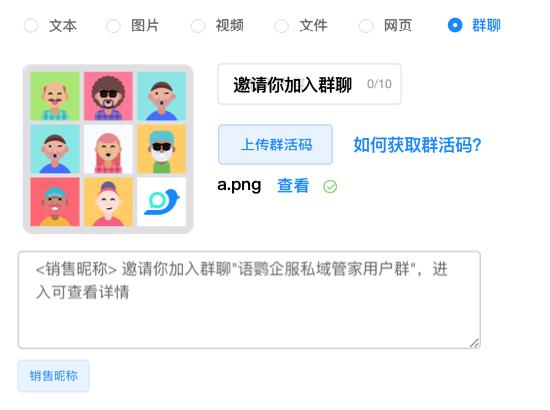 附加多媒体处选择【群聊】类型,上传第一步下载的二维码,并填写相关引导语即可