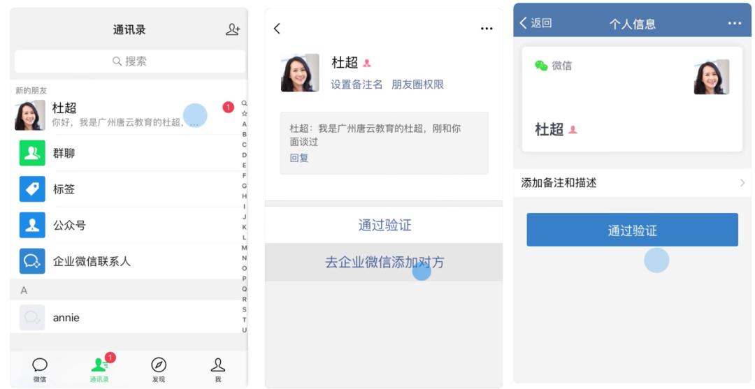 同时,你还可以回到个人微信,继续点击「通过验证」(三级留存),就可以把对方加为你的微信好友了(过一段时间再添加,效果更好哦)。