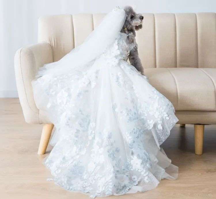 ▲ 宠物狗身穿《海的女儿》婚纱。这件衣服的重量超过4 斤。