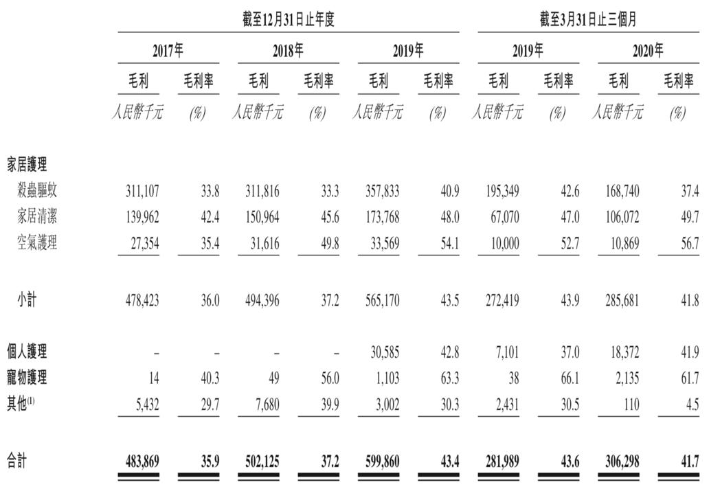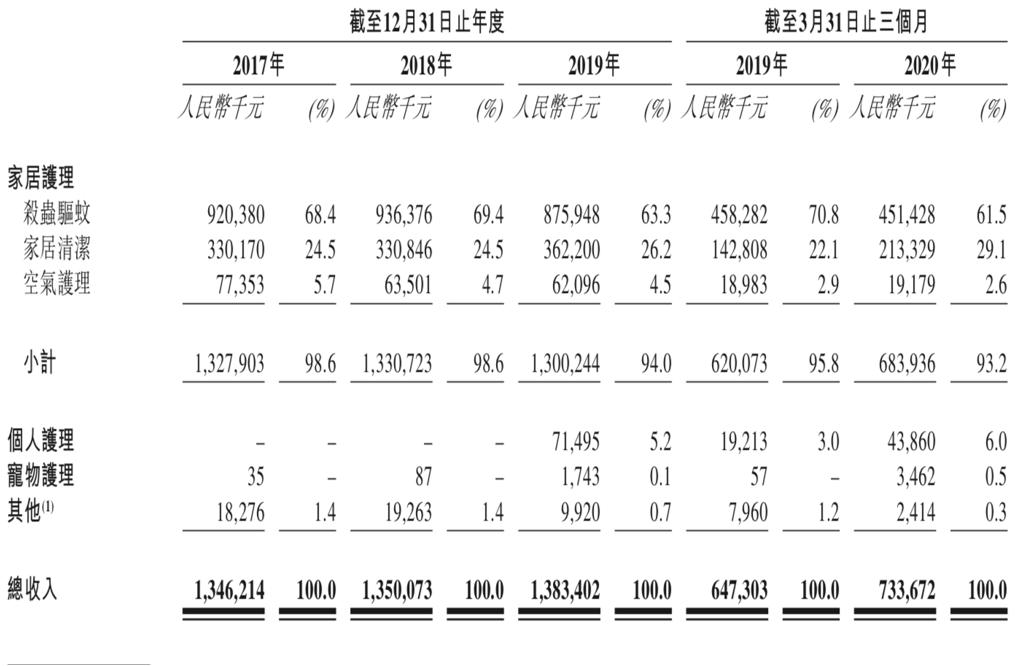 从收入构成来看,家居护理是朝云集团最倚赖的收入来源,2017年至2019年的收入占比分别为98.6%、98.6%和94.0%;2020年第一季度的收入占比则降低至93.2%,其主要源于个人护理产品的需求大幅增加所致。