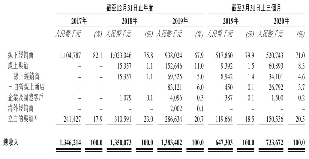 2017年至2019年,朝云集团通过线下渠道销售产生的收入占总收入的百分比分别为82.1%、75.8%和67.9%,而通过线上渠道销售产生收入占比则从2018年的1.1%大幅增至2019年的11.0%。2020年第一季度,朝云集团线下、线上的收入占比分别为71.0%和8.3%。