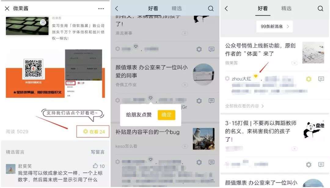 • 2019年3月14日,点赞图标“好看”变成了“在看”;