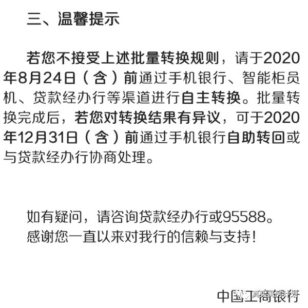 如您不希望批量转换,可在2020年9月1日至2020年12月31日前往贷款经办机构协商处理。