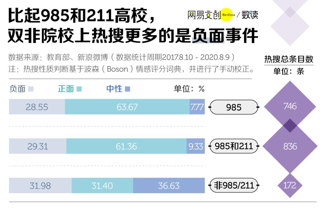 名校自带光环,上热搜也更偏正面,985 和 211 院校中正面热搜的比例为 61.36 %。