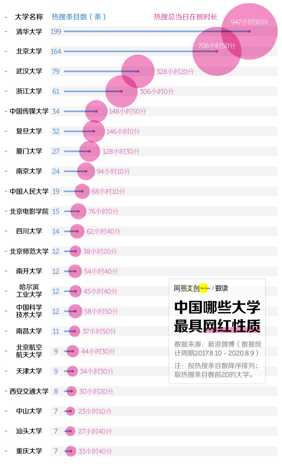 清华、北大热搜数据表现遥遥领先,清华大学以 947 小时的总在榜时长和 199 条热搜条目总数成为中国最具网红性质的大学。